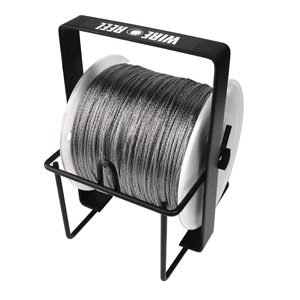 Tabletop wire caddy holds 5lb. spools of of braided picture wire for easy dispensing and control of spools on your work table. Holds all wire gauges and has center slot to feed wire without it riding off of the spool. Complete with handle for portability.